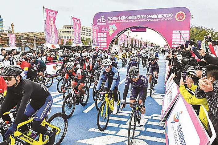 10月18日清晨,衡水湖马拉松广场人声鼎沸,彩旗招展,随着发令声响,2025中国公路自行车公开赛(衡水站)正式拉开帷幕。来自全国的1200余名骑手分七个组别依次出发,在“湿地画廊·绿动新生”的主题赛道上展开激烈角逐,为秋日的衡水注入无限活力。图为比赛现场。