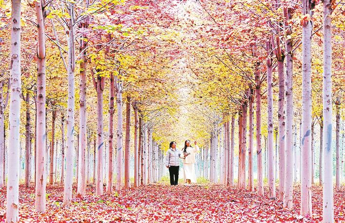 十月二十二日,游客在邯郸市峰峰矿区义井镇万亩秀林游玩。各地秋色愈浓,美不胜收。新华社发(郝群英 摄)