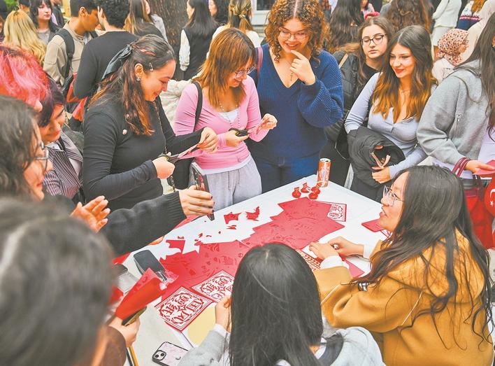 10月22日,土耳其学生在伊斯坦布尔举行的中国文化节上体验中国剪纸。当日,第二届中国文化节在土耳其伊斯坦布尔海峡大学举行。新华社记者 刘磊 摄