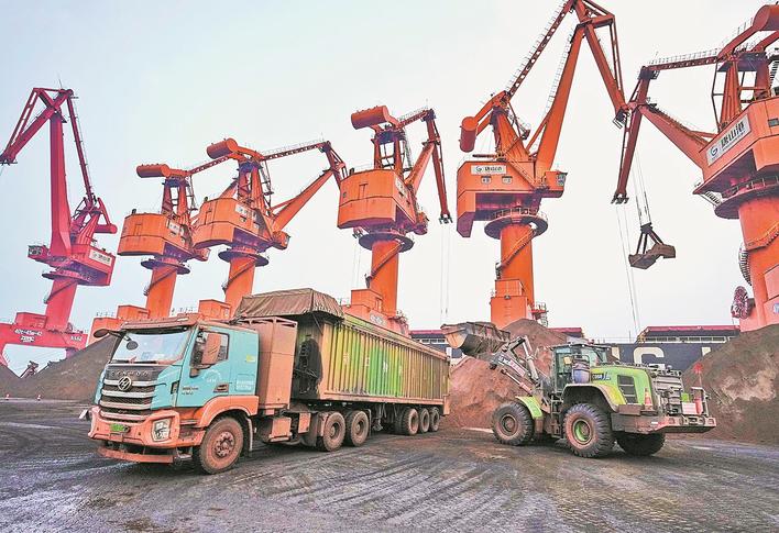 10月28日,在唐山海港经济开发区唐山港京唐港区矿石码头,工人操作电动铲车往电动重卡上装货。