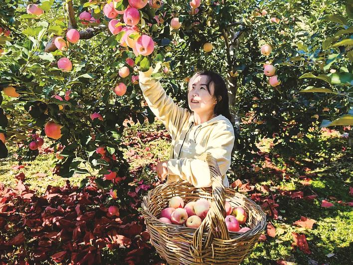 近年来,迁西县依托得天独厚的自然条件,大力发展特色林果产业,从提升品质、调优结构、延伸链条、拓展渠道、打造品牌五个方面持续发力,带动农民增收致富。图为游客在采摘苹果。