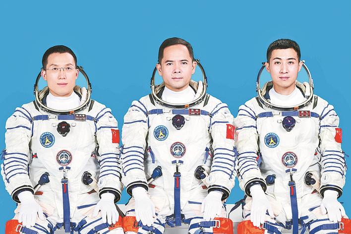 这是神舟二十一号航天员张陆(中)、武飞(右)、张洪章。 执行神舟二十一号载人飞行任务的航天员乘组由张陆、武飞、张洪章3名航天员组成。张陆担任指令长。新华社发