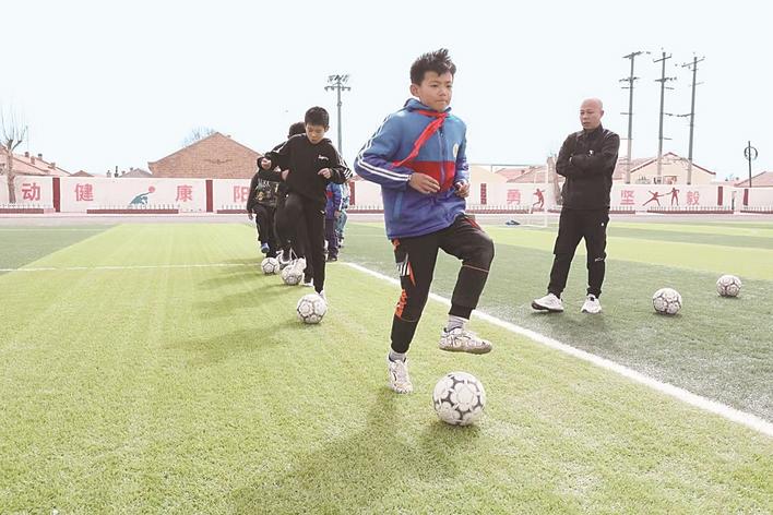 深秋的坝上天气转寒,康保县东关小学的绿茵场上却是一派热闹景象,一群活力四射的足球小将怀揣对足球的热爱,在草地上奔跑、拼抢,每一次传球、每一次射门,都带着满满的冲劲儿。图为学生们在操场上训练。刘雅轩 摄