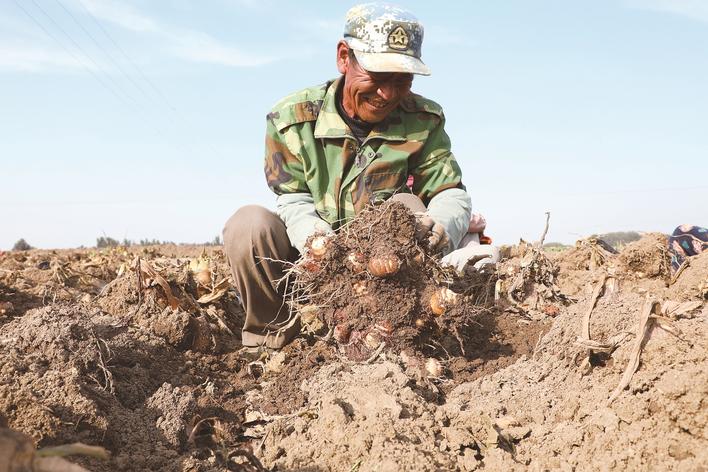 近年来,滦南县大力发展特色农业和订单农业,积极引导农民引种、试种适销对路的特色农产品。该县胡各庄镇引进芋头进行种植,通过订单销往全国各地,成为当地农民增收致富的一个种植新品种。图为滦南县胡各庄镇桑园村农民正在收获芋头。刘佳男 荣琳 摄