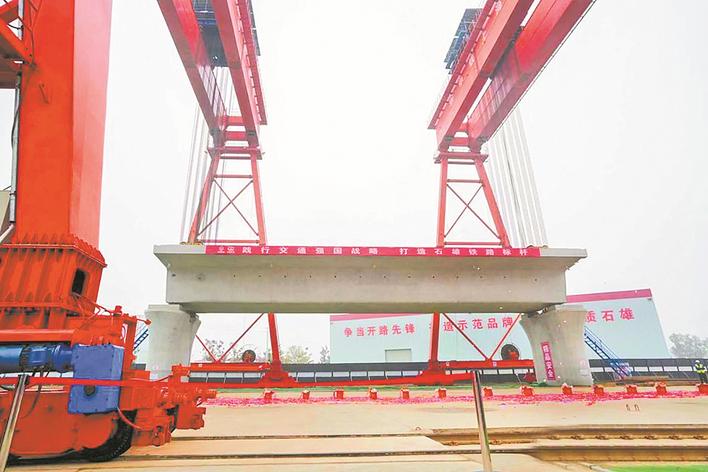 本报讯(长城网·冀云客户端记者周亚彬 通讯员陆爽)10月31日上午,在石雄铁路定州区段建设现场,在大型机械的精准操控下,首榀重达数百吨的预制箱梁稳稳落于桥墩上,标志着石雄铁路建设进入桥梁架设阶段,为后续无砟轨道铺设打下了坚实基础。