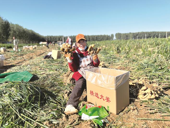 田垄间,30余名“生姜管家”正各司其职,忙得热火朝天。剪苗、去泥、分拣、装箱,一系列动作娴熟利落、一气呵成。“收入不错,还能照顾家!”来自东门庄村的魏秀芝手上不停,脸上洋溢着满足的笑容。像她一样,越来越多村民把这份“家门口的工作”当成了增收“香饽饽”,实现了顾家与增收的“双向奔赴”。
