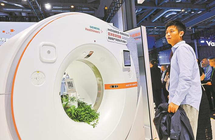 11月6日,参观者在西门子公司展台一个CT机展品旁驻足观看,这是西门子公司首款国产双源光子计数CT,也是该产品亚洲首发首展。 新华社记者 方喆 摄