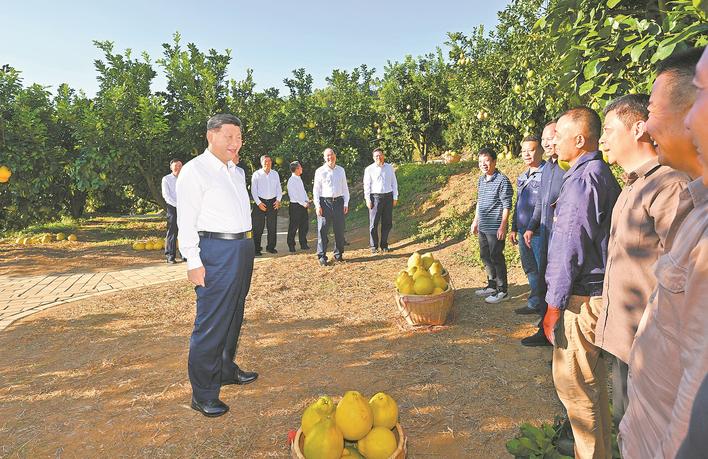 金柚是梅州的特色农产品。正值收获季节,柚子园硕果累累。习近平来到雁洋镇南福金柚种植基地,在展示厅听取广东加大对革命老区支持力度、推进乡村全面振兴等情况汇报,察看柚子及其加工产品、文创产品。他走进果林,同果农和农技人员亲切交流。得知今年金柚喜获丰收、销路畅通,习近平十分高兴。他指出,发展乡村特色产业是推进乡村全面振兴的基础,要加强科技应用,推动农文旅融合,不断延伸产业链、增加附加值,带动更多农民群众增收致富。