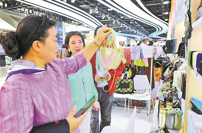 进博会观众在挑选九丁端箱包。 本报记者 烟成群 摄