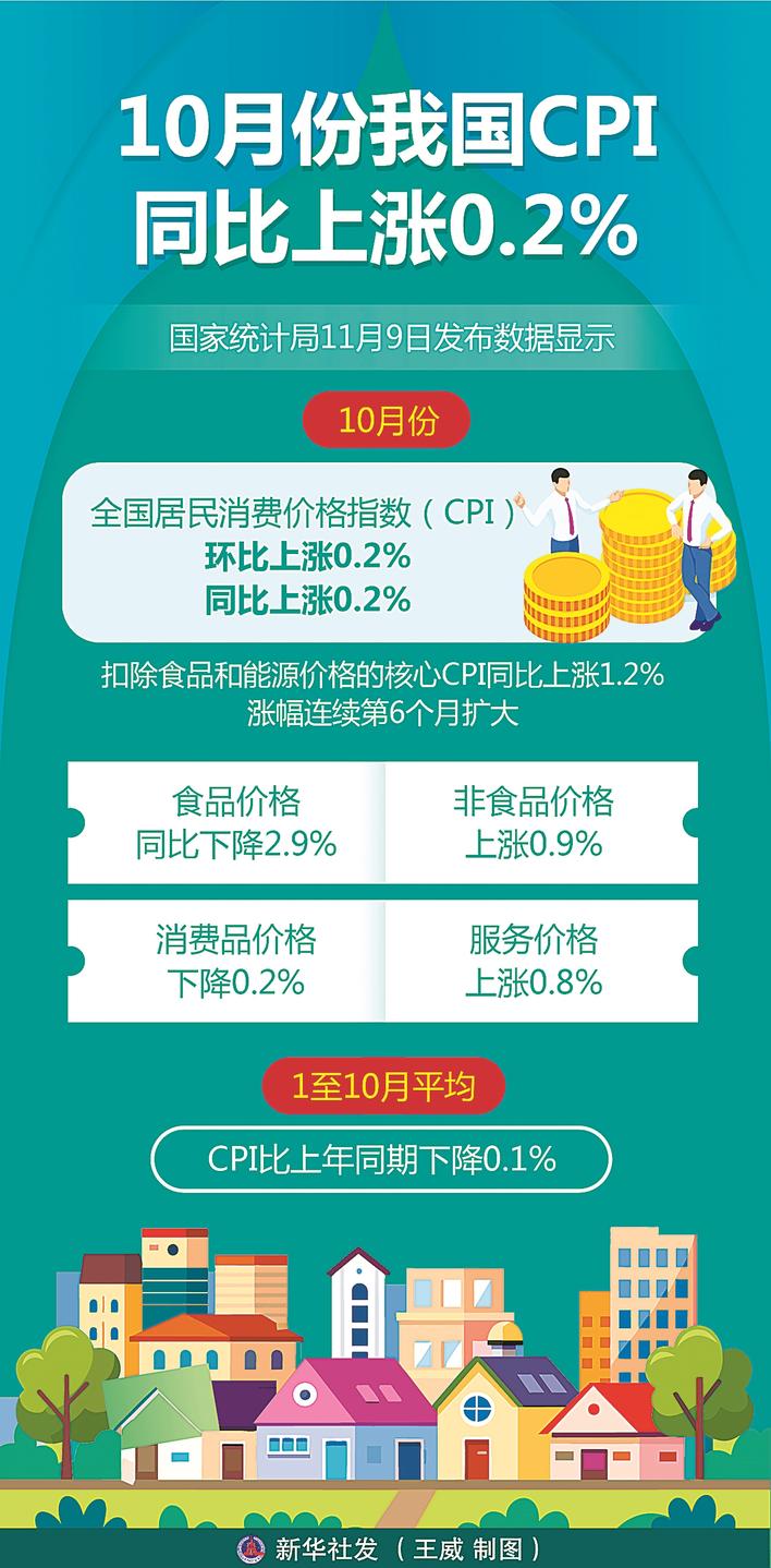 “10月份,扩内需等政策措施持续显效,叠加国庆中秋假期带动,CPI同比和环比均上涨0.2%,扣除食品和能源价格的核心CPI同比上涨1.2%,涨幅连续第6个月扩大。”国家统计局城市司首席统计师董莉娟说。