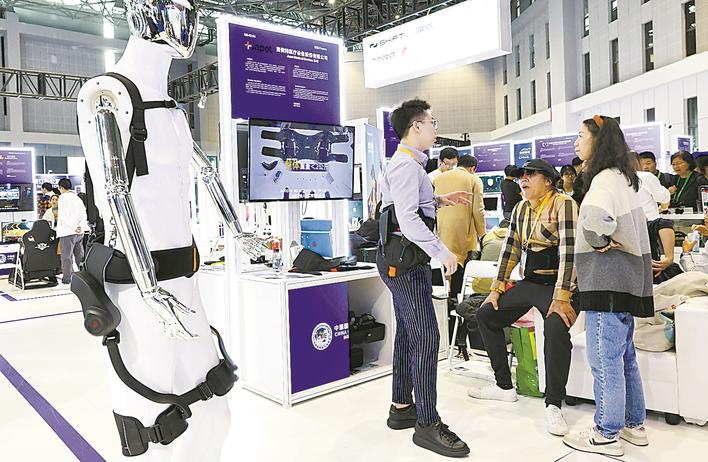 11月9日,工作人员(左)在向参观者介绍一款外骨骼产品。本届进博会创新孵化专区以“在中国,切入新赛道”为主题,为参会全球初创企业和人才共同探索开拓中国市场提供科技创新资源与合作机遇。 新华社记者 方喆 摄