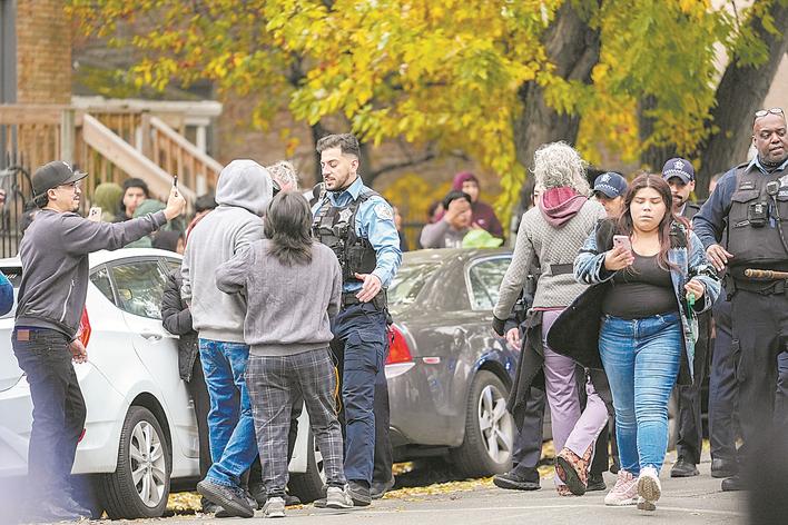 11月8日,在美国伊利诺伊州芝加哥市,人们抗议激进执法行动。美国国土安全部8日通报,联邦执法人员当天在伊利诺伊州芝加哥市执行打击非法移民行动时,遭一名男子开枪射击。芝加哥警方说,这起事件未造成人员伤亡。新华社/美联