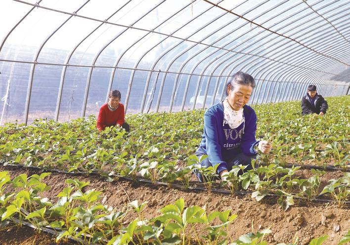 近年来,平泉市扎实推进乡村振兴战略,通过产业结构调整,加大科技培训力度,大力发展食用菌、设施菜、林果、中药材等种植产业,促进农民致富增收。图为该市道虎沟乡农民在温室棚内管理草莓。李平文 摄