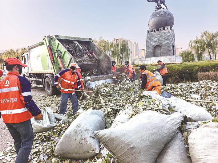 天气冷凉,城区道路两侧树木落叶量大幅攀升。双桥区环境卫生管理局迅速行动,科学部署,全面启动秋季落叶清扫保障专项活动。通过一系列扎实有效的举措,城区道路环境显著改善,为广大市民营造了整洁、优美的城市环境。图为落叶清扫现场。霍杰 摄