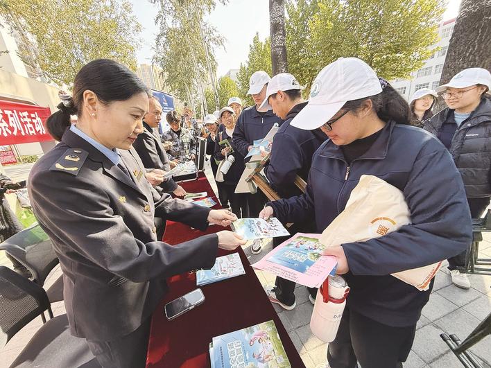 保定市市场监督管理局精准普法进校园向学生发放宣传手册。
