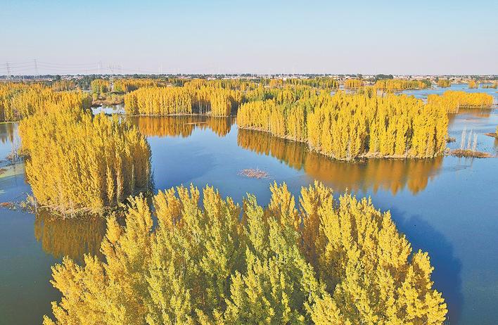 隆尧县亦城村泜河风光(11月8日摄,无人机照片)。 初冬时节,在邢台市隆尧县亦城村泜河沿岸,树叶金黄,与水面、河岸相映衬,勾勒出一幅美丽和谐的自然画卷。 近年来,隆尧县大力实施泜河综合治理与水生态涵养工程,通过开展河道疏浚整治、生态补水、沿河绿化等工作,将泜河打造成为“水清、河畅、岸绿、景美”的休闲打卡地,有效提升沿线村庄人居环境。 新华社记者 牟宇 摄