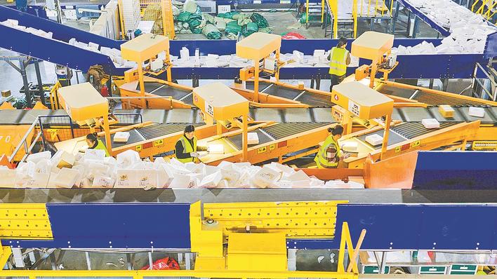 11月11日,工作人员在中国邮政集团有限公司河南省睢县分公司邮件处理中心智能快递流水线上分拣快递包裹。新华社发