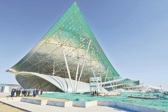 北京城市副中心站综合交通枢纽工程和“京帆”屋盖。新华社记者 鞠焕宗 摄 扫码看视频