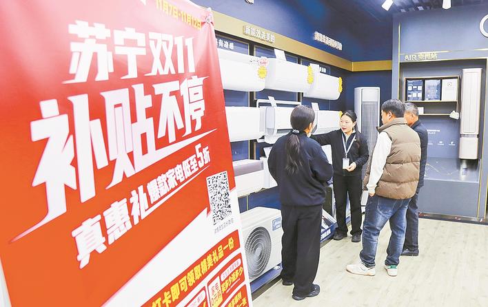 11月11日,在河南省洛阳市汝阳县刘伶路苏宁店,店员向消费者宣传国家补贴政策。新华社发