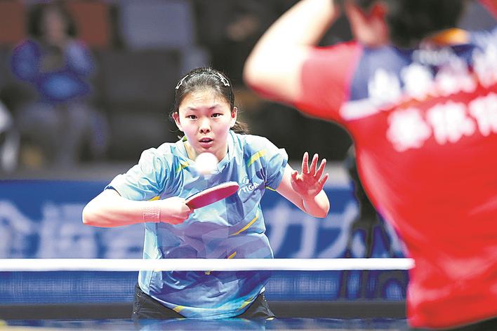 姚睿轩(左)在比赛中回球。新华社记者 梁旭 摄