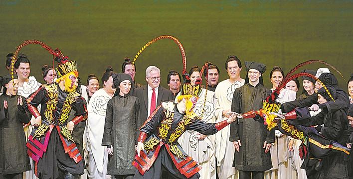 11月14日晚,在美国旧金山,《猴王悟空》主创人员在首演后谢幕。改编自中国古典名著《西游记》的歌剧《猴王悟空》14日晚在美国旧金山举行全球首演,将孙悟空的故事带上美国歌剧舞台。 新华社记者 吴晓凌 摄