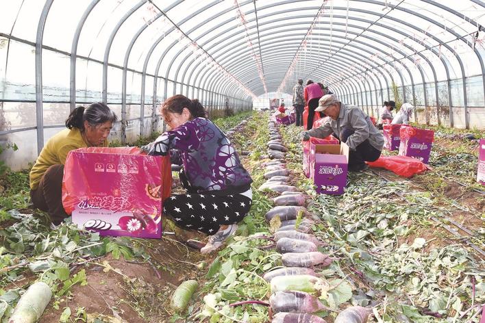 日前,张家口市下花园区花园乡上花园村百亩大棚里暖意融融,接茬种植的“冰激凌”萝卜喜获丰收,村民们正忙着采收、打包、装箱、搬运,一派喜人景象。图为村民在采收、装箱。院玉顺 摄