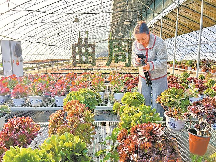 在曲周县“一品一播”多肉直播基地里,主播芦亚宵正通过手机向全国各地客户热情推介多肉;