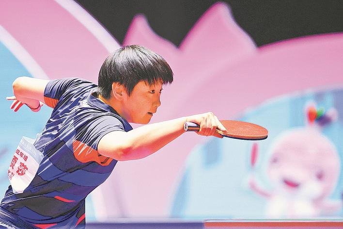 11月18日,河北队选手孙颖莎在比赛中回球,她在单打比赛中3比0战胜辽宁队选手刘斐。当日,在澳门举行的第十五届全国运动会乒乓球女子团体四分之一决赛中,河北队3比1战胜辽宁队,晋级半决赛。新华社记者 梁旭 摄