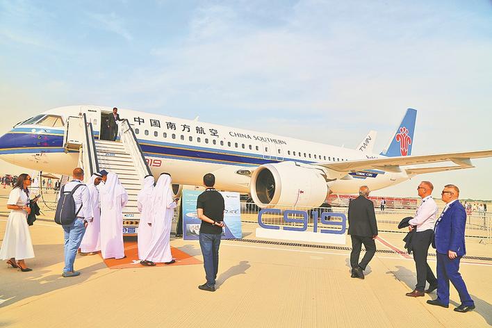 11月17日,在阿联酋迪拜,观众在2025迪拜航空展上参观中国南航的C919飞机。 2025迪拜航展17日在阿联酋迪拜世界中心开幕。两架中国自行研制的C919大飞机参展。本届迪拜航展为期5天,以“未来已来”为主题,于11月17日至21日举行,为全球航空业搭建重要交流合作平台。中国商用飞机有限责任公司携一架C919飞机和一架C909飞机参展,中国南方航空公司携一架C919飞机参展。这是国产C919飞机首次在中东亮相。中国商飞在现场进行了C919飞行展示。新华社记者 温新年 摄