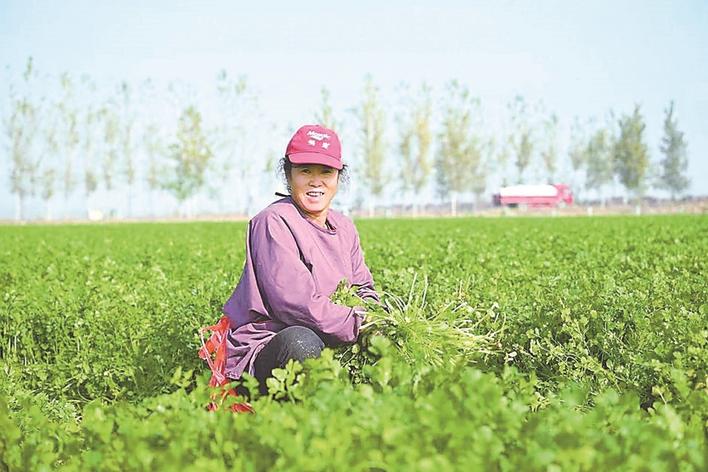 近日,深州市护驾迟镇西王庄村香菜种植基地内一片繁忙景象。近年来,该镇立足资源优势,大力发展农产品精深加工,培育面粉加工、脱水蔬菜、饲料生产等特色产业集群,构建起企业、集体、农户多方共赢的发展格局。图为村民在采收香菜。刘娟 周灿 摄
