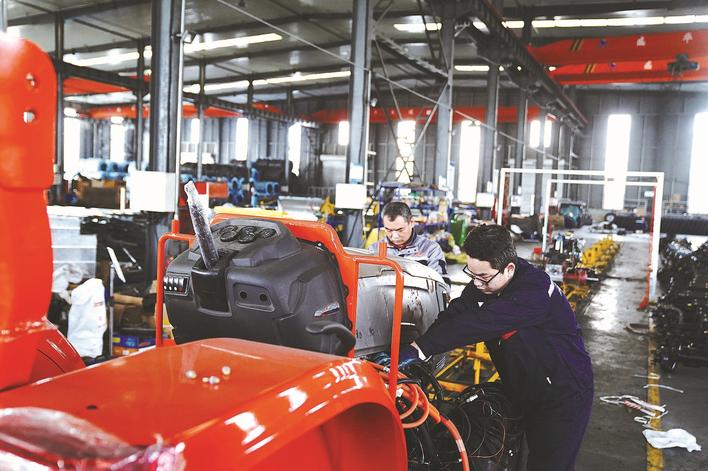在邢台朗泰农业科技有限公司生产车间,员工组装增程式拖拉机。