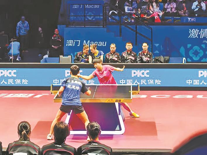 河北队选手孙颖莎(粉衣)在比赛中。当日,在澳门举行的第十五届全国运动会乒乓球女子团体金牌赛中,河北队对阵山东队。 本报记者 高祎男 摄