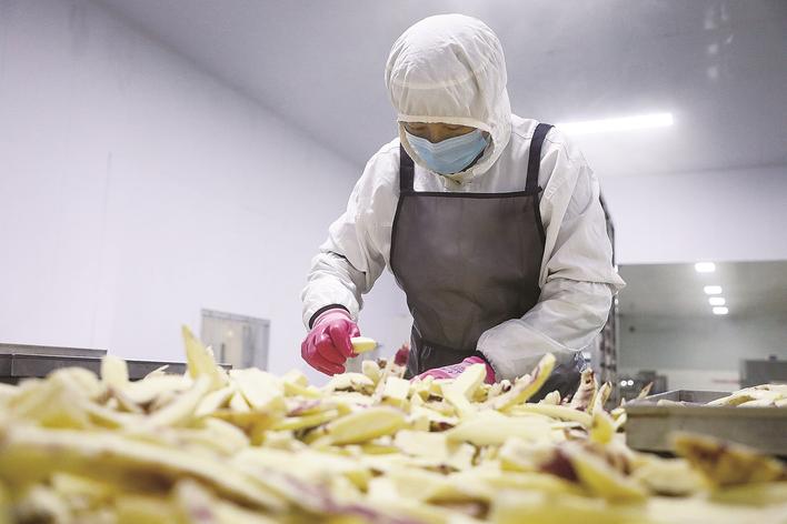 在滦南县安各庄镇的一家薯干加工厂里,阵阵香甜扑面而来。工人们有条不紊地完成红薯清洗、蒸煮、分拣、烘干、包装等工序,不起眼的红薯历经匠心加工,摇身变为晶莹软糯、风味浓郁的红薯干,成为点亮村民增收路的“致富宝”。近年来,滦南县依托“公司+合作社+农户”的经营模式,持续升级红薯深加工技术,强化合作社引领作用,推动红薯产业从“种得好”向“卖得俏、附加值高”转型,不仅做大做强了乡村特色产业,更让这条香甜的致富路越走越宽。图为滦南县安各庄镇一家薯干加工厂内,工人在加工薯干。