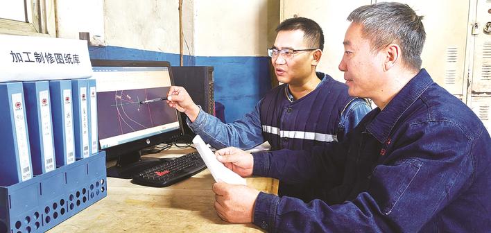 开滦股份吕家坨矿业公司制修厂为提升服务生产与应急制修效能,对以往加工过的产品图纸进行整合与归类,建立加工制修图纸库,实现“快速查询、精准调用”。图为该公司技术人员在建立加工制修电子图纸库。 张婧 摄