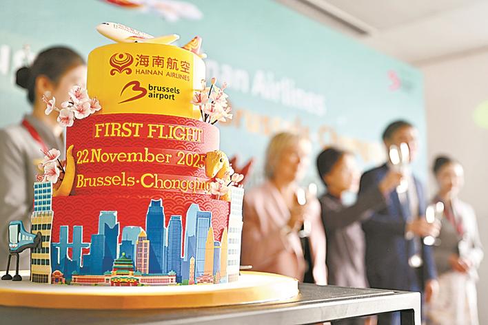 这是11月22日在比利时布鲁塞尔国际机场举行的海南航空布鲁塞尔至重庆直飞航线首航仪式上拍摄的主题蛋糕。中国海南航空公司22日正式开通布鲁塞尔至重庆直飞航线。布鲁塞尔国际机场举行首航仪式,以车辆护送仪式欢送首个航班启程。新华社记者 吕优 摄