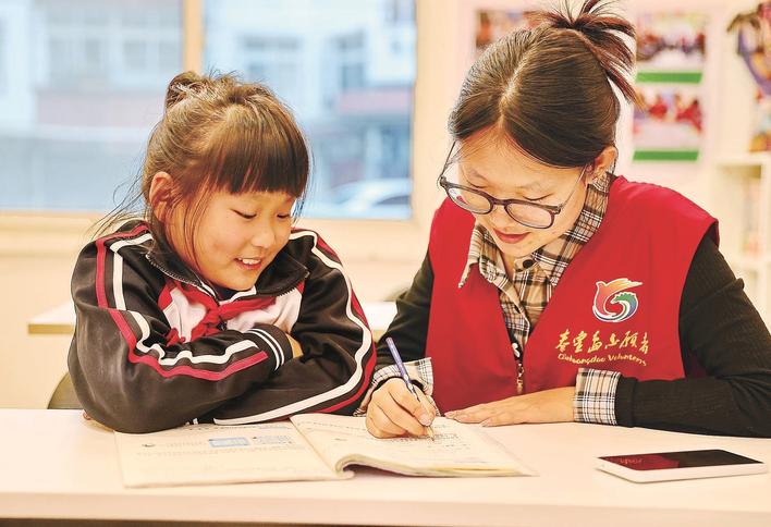 近日,秦皇岛市海港区河东街道工人南里第二社区新时代文明实践站结合辖区家庭实际需求,依托社区“小候鸟驿站”推出公益性课后托管服务。据了解,该社区积极联动周边高校资源,在工作日下午4点至5点30分,有序组织大学生志愿者走进社区“小候鸟驿站”内,为参加托管服务的小朋友辅导作业、梳理知识点等,也带领大家开展趣味游戏、互动体验等活动。图为大学生志愿者为小朋友辅导作业。曹建雄 摄