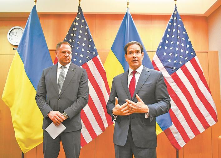 11月23日,在瑞士日内瓦美国常驻联合国日内瓦办事处代表团驻地,美国国务卿鲁比奥(右)在记者会上发言。 针对美方就结束俄乌冲突提出的28点新计划,美国、乌克兰、欧盟及英法德三国代表23日在瑞士日内瓦举行会谈。美国国务卿鲁比奥、美国中东问题特使威特科夫代表美方出席此次会谈,乌克兰代表团由乌总统办公室主任叶尔马克率领。此外,法国、德国和英国的国家安全顾问以及欧盟代表也参加磋商。新华社记者 连漪 摄