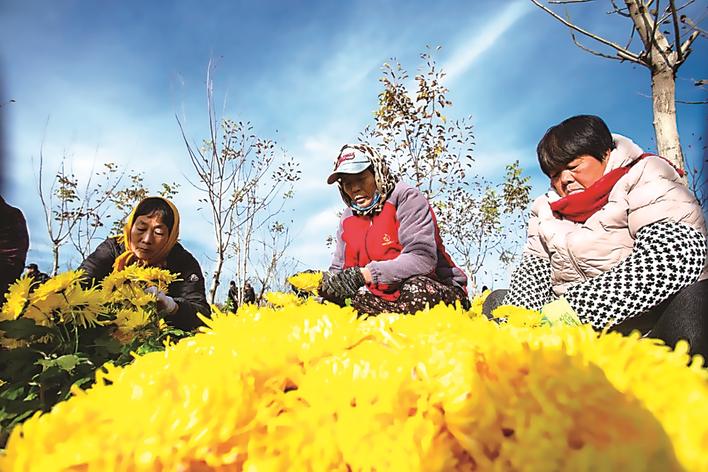 近日,走进邯郸市复兴区二六七二街道前牛叫村,连片的金丝皇菊迎风摇曳,汇成一片灿烂的海洋,此时正值盛花期,淡雅的菊香在空气中弥漫。田间地头,村民们正忙碌地穿梭于花丛间,将一朵朵饱满的金丝皇菊采摘入筐。通讯员 闫盼 摄