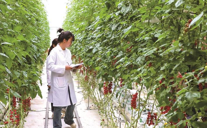 农业农村部规划设计研究院永清试验基地,工作人员正在记录西红柿成长数据。