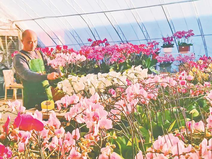 在承德市双滦区偏桥子镇大贵口村灾后重建的蝴蝶兰种植大棚内,农户在打理新种植的蝴蝶兰。