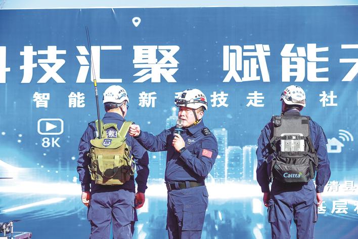 近日,永清县明珠广场人头攒动、气氛热烈,一场以“科技汇聚 赋能无限”为主题的基层科普宣传行动计划公益活动在此拉开帷幕。图为永清县曙光救援队工作人员向居民介绍户外救援设备。庞趁友 摄