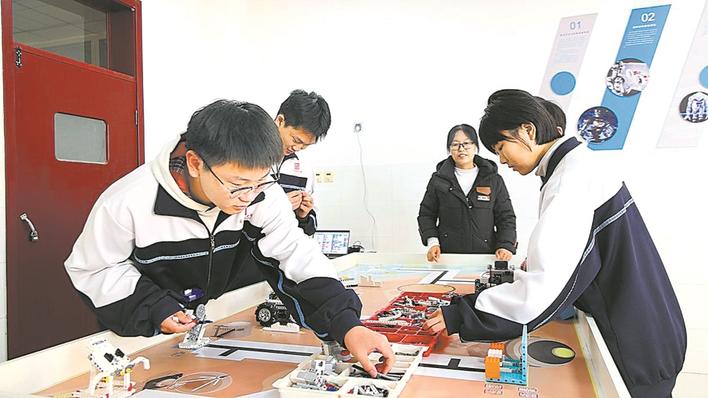 日前,在沧州市南皮县第一中学,一堂有趣的“人工智能”普及课正在开展。目前,人工智能教育已覆盖南皮县35所学校,实现中小学各学段普及。图为人工智能社团学生动手组装智能机器人。赵宇 王建宏 摄