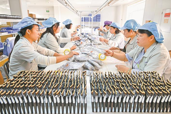 12月4日,青县一家化妆刷生产企业的员工在车间内包装化妆刷。