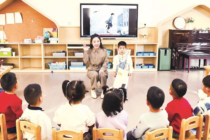 近日,张家口市桥东区红旗楼幼儿园开展讲好红色故事主题教育,通过故事启航、项目探究、行动延伸等环节培养幼儿自制绘本、编排剧情、演绎经典的能力,让孩子们不仅能成为红色经典的学习者,更能成为红色文化的传播者。图为小朋友和家长在表演《小报童》。 岑屹 摄