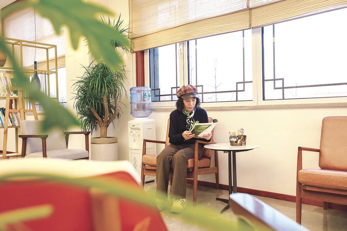 在林栖谷森林康养度假区内,一位阿姨正在阅读。