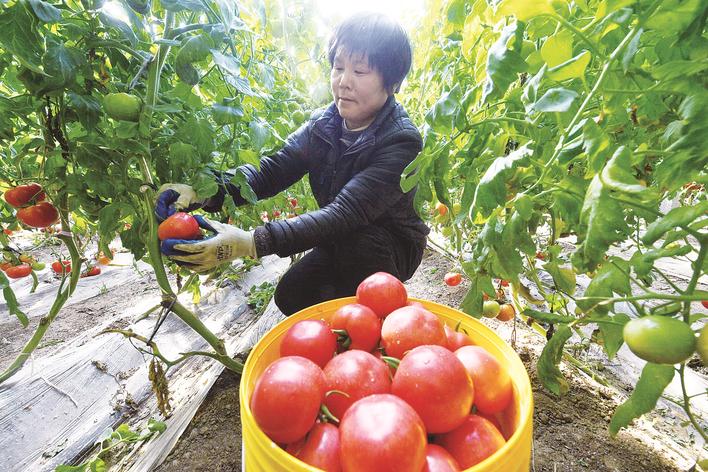 走进留楚镇肖店村一家庭农场的日光温室,暖意扑面而来,泥土的芬芳与西红柿的清甜交织在一起。种植户王爱超正手持剪刀,小心翼翼地将成熟的西红柿从藤蔓上剪下,动作娴熟利落。“这一茬西红柿是今年8月份种的,用的是智能温室控制系统和水肥一体化技术,全程熊蜂授粉、施有机肥,不用化学农药。”王爱超一边将果实放进竹篮,一边笑着介绍,“你看这果子,皮薄肉厚、汁水饱满,口感沙甜,市场特别抢手。我这10个棚今年能卖60多万元呢!”来自天津的批发商张老板前几天就与王爱超商定好采收时间。“饶阳西红柿品质好、耐储存,我们每年这个时候都来收,拉回去很快就能卖完。”他一边记录订单,一边说。