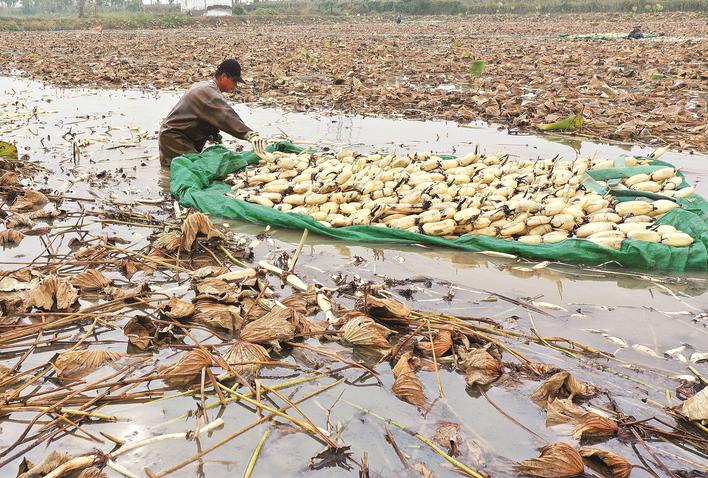 近日,新河县新河镇白穴口村的千亩藕田迎来收获季,挖藕人忙着采收鲜藕,供应市场。近年来,该县利用丰富的水资源优势,引导农民发展浅水莲藕种植产业,助力农民增收致富。 记者 刘杨 通讯员 范永吉 李世强 摄