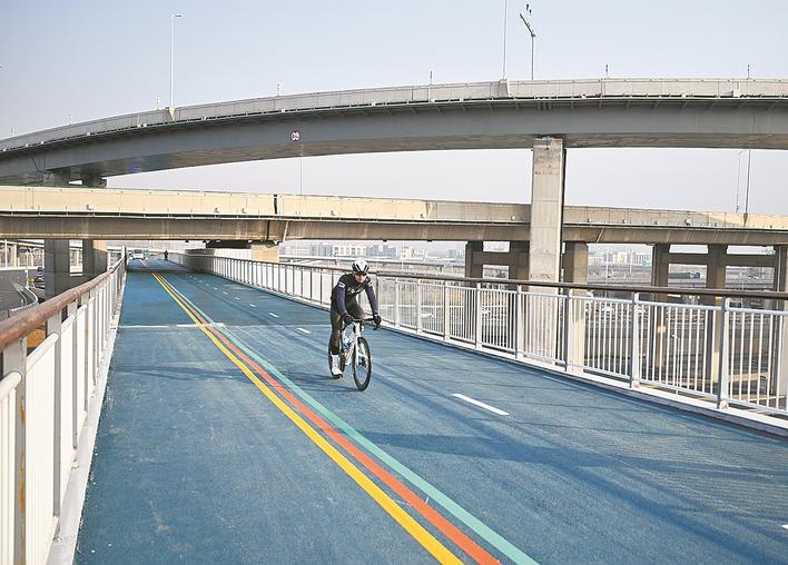 12月10日,骑行者在石家庄市环城绿道跨石太铁路桥上骑行。 新华社记者 牟宇 摄