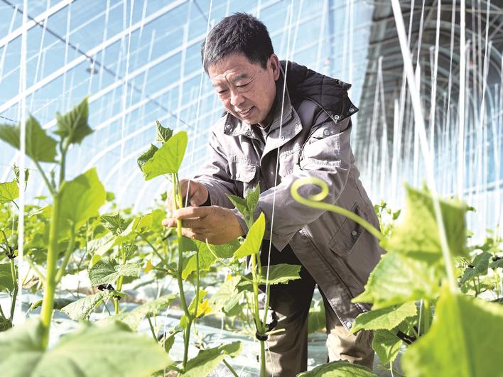 近年来,迁西县把发展壮大村集体经济作为推进乡村振兴的重要抓手,聚焦特色农业产业,因地制宜谋划实施一批接地气、见效快的惠民项目,不仅让村民实现“家门口就业增收”,更推动村级集体经济从“薄弱散”向“强优实”转变。图为迁西县尹庄乡樊庄村高效农业大棚内,农户在打理黄瓜藤。王喜增 摄
