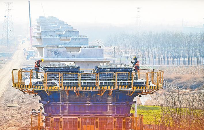 12月5日,中铁十一局建设者在石雄铁路安定特大桥16号墩施工作业。